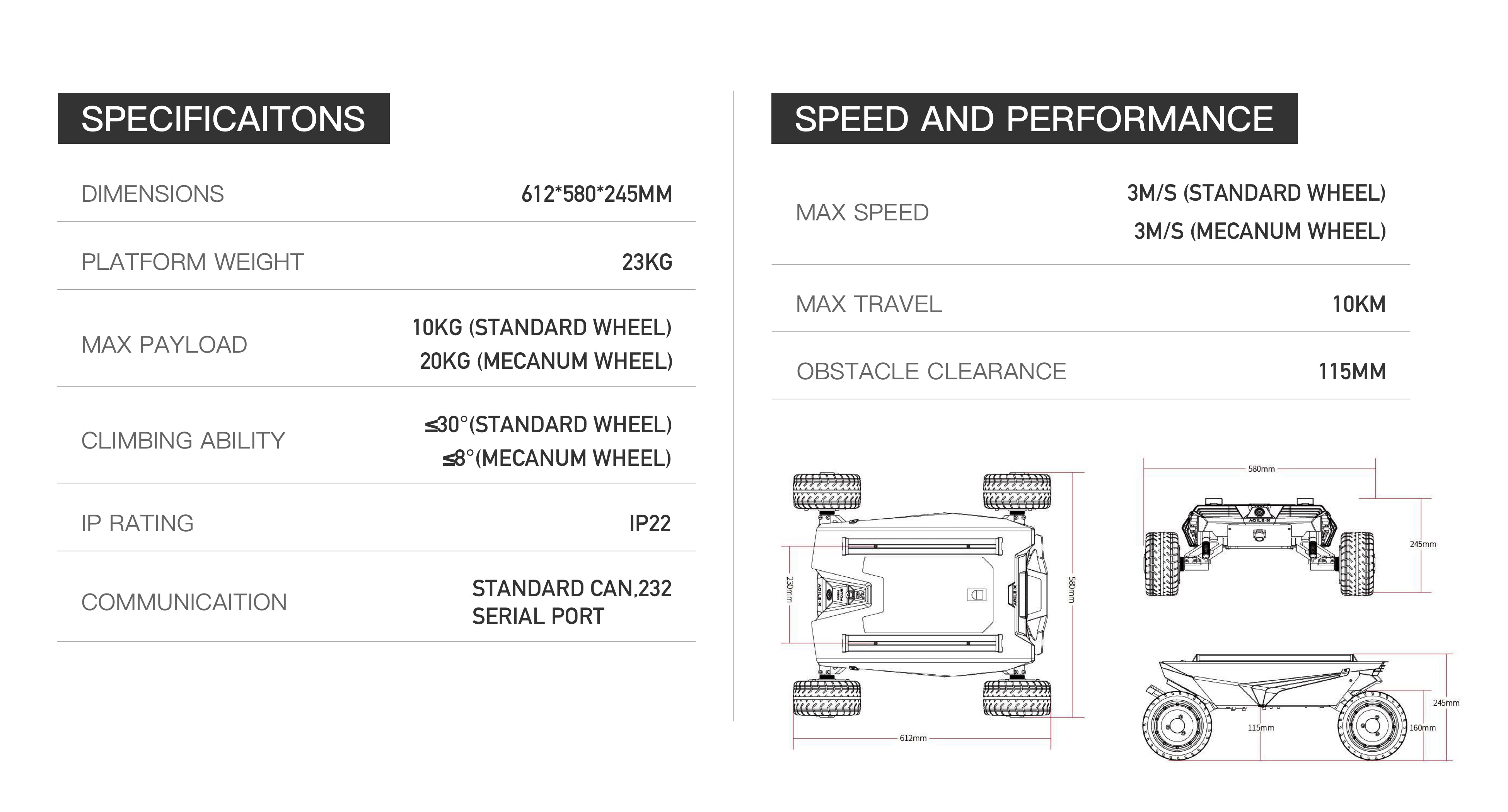 SCOUT MINI is available with a choice of standard wheels and mecanum wheel kits. Mecanum wheels allow for omnidirectional driving compared to the differential drive steering of standard wheel kits.